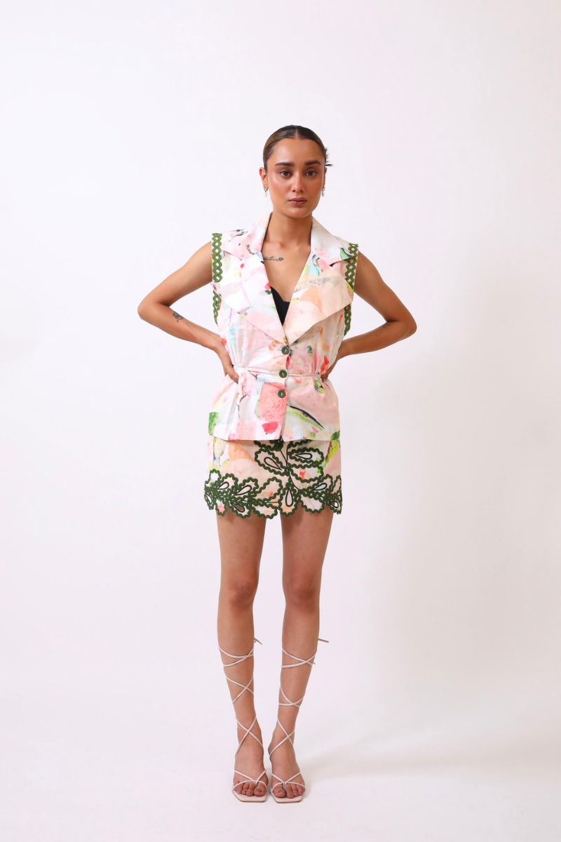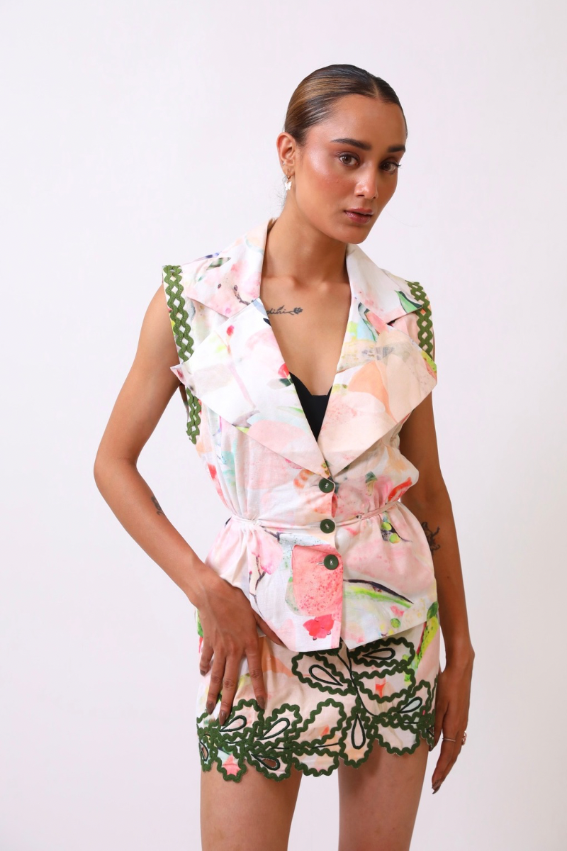 This statement two piece dress reimagines retro. Hand-embroidered in-style florals with a bold pink petal burst, it's crisp, clean, and a walking piece of art. A tribute to expressive femininity with structure.
