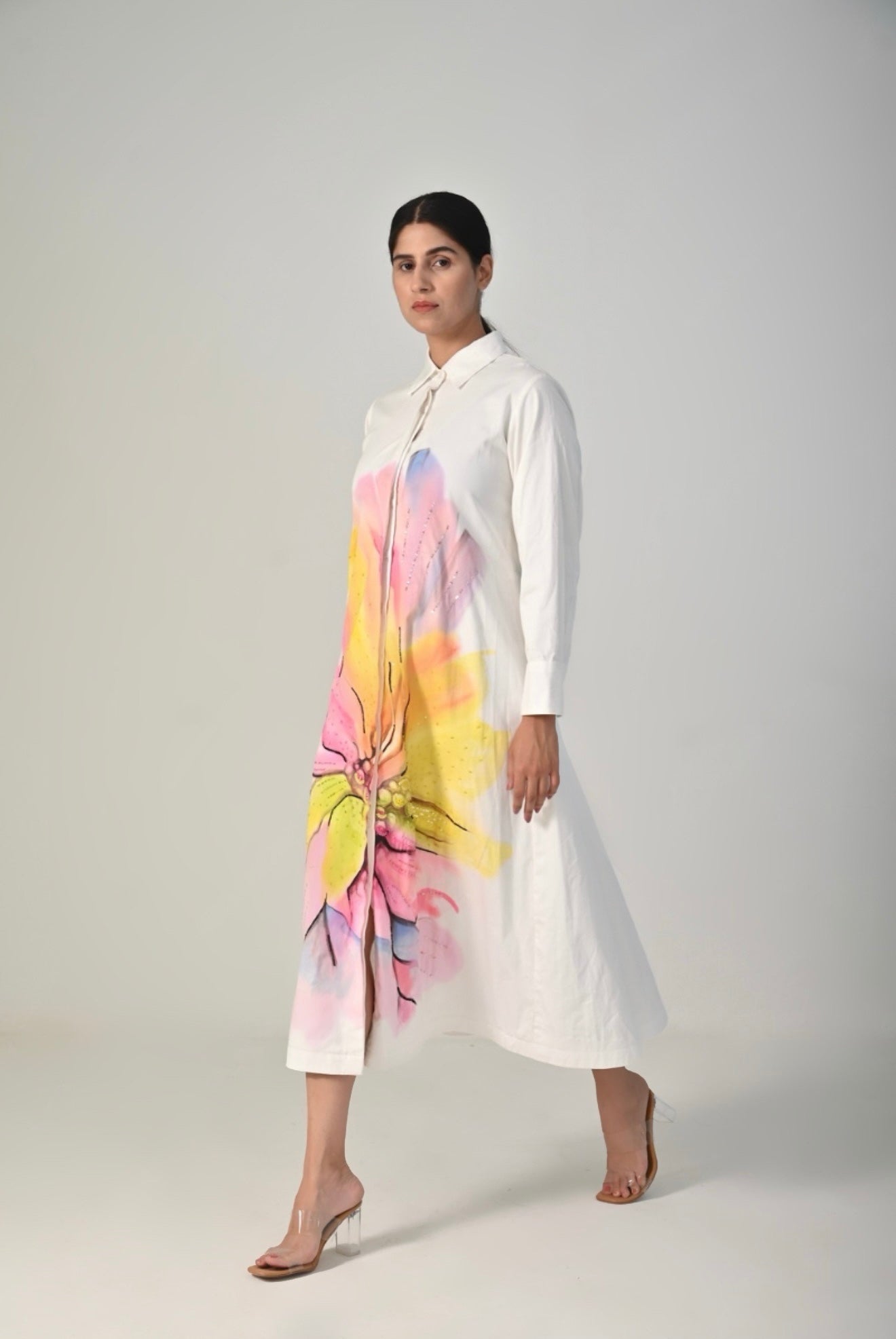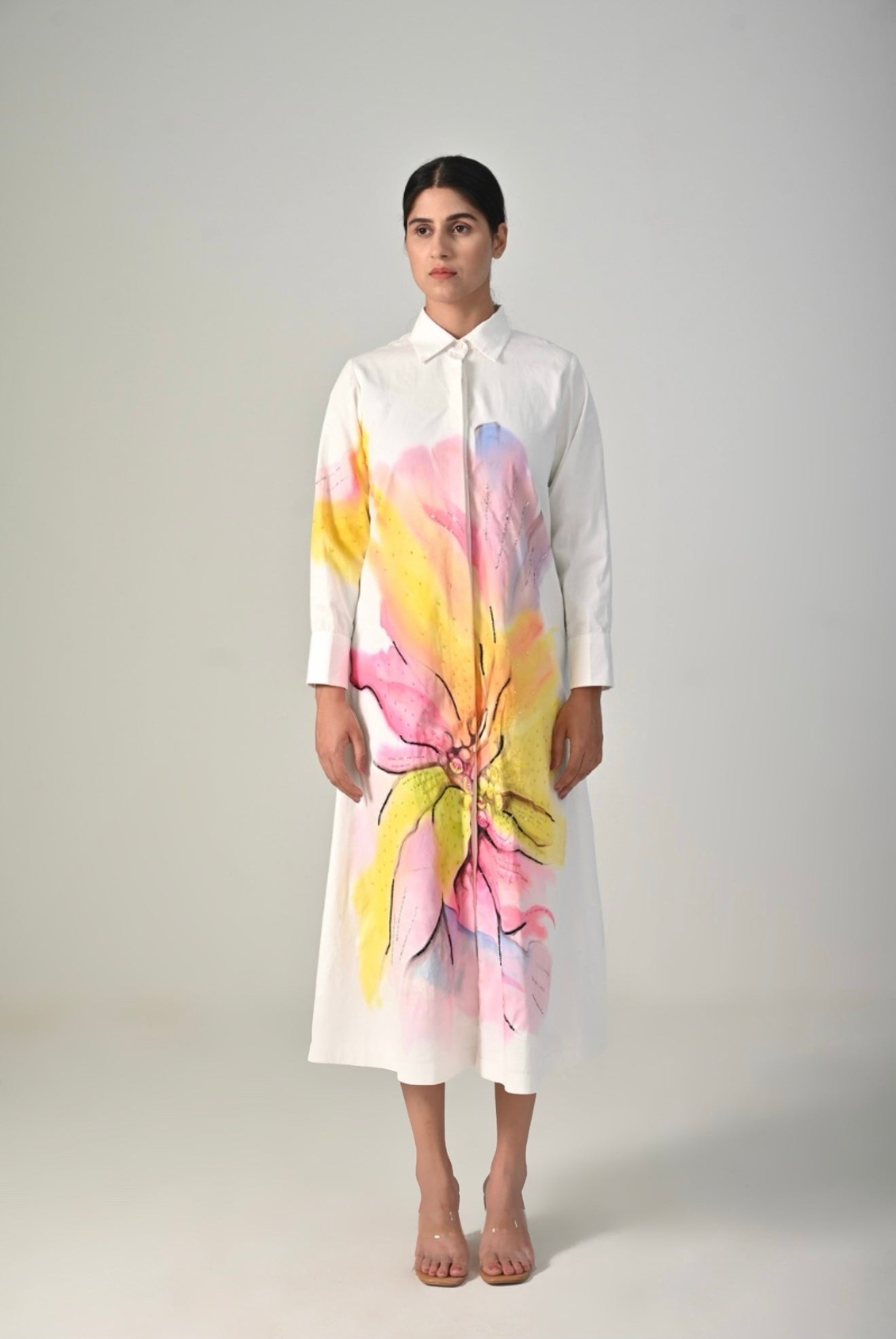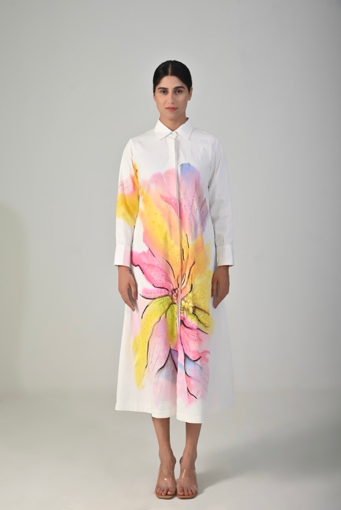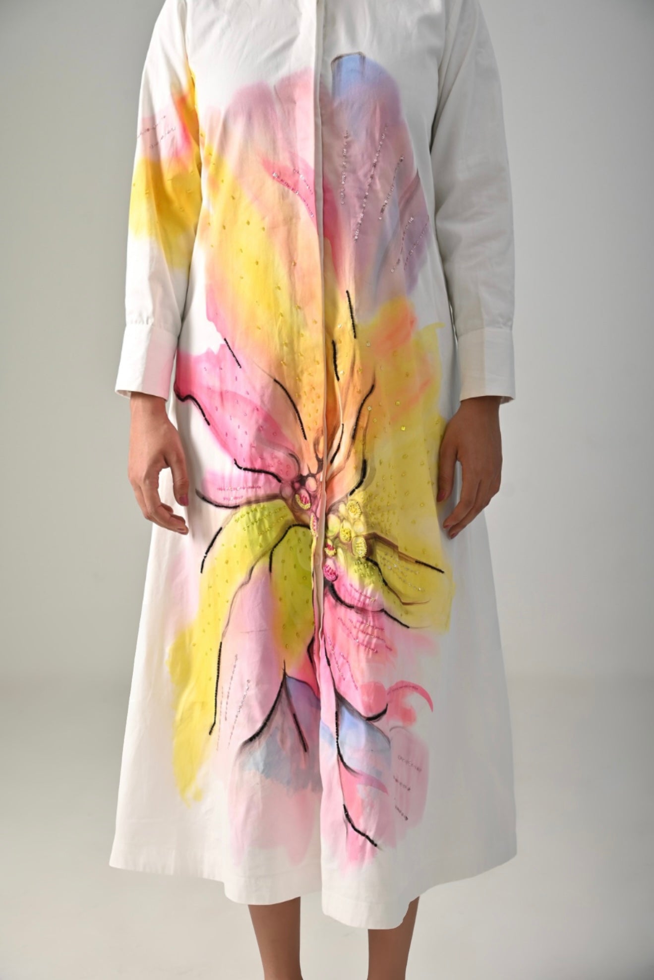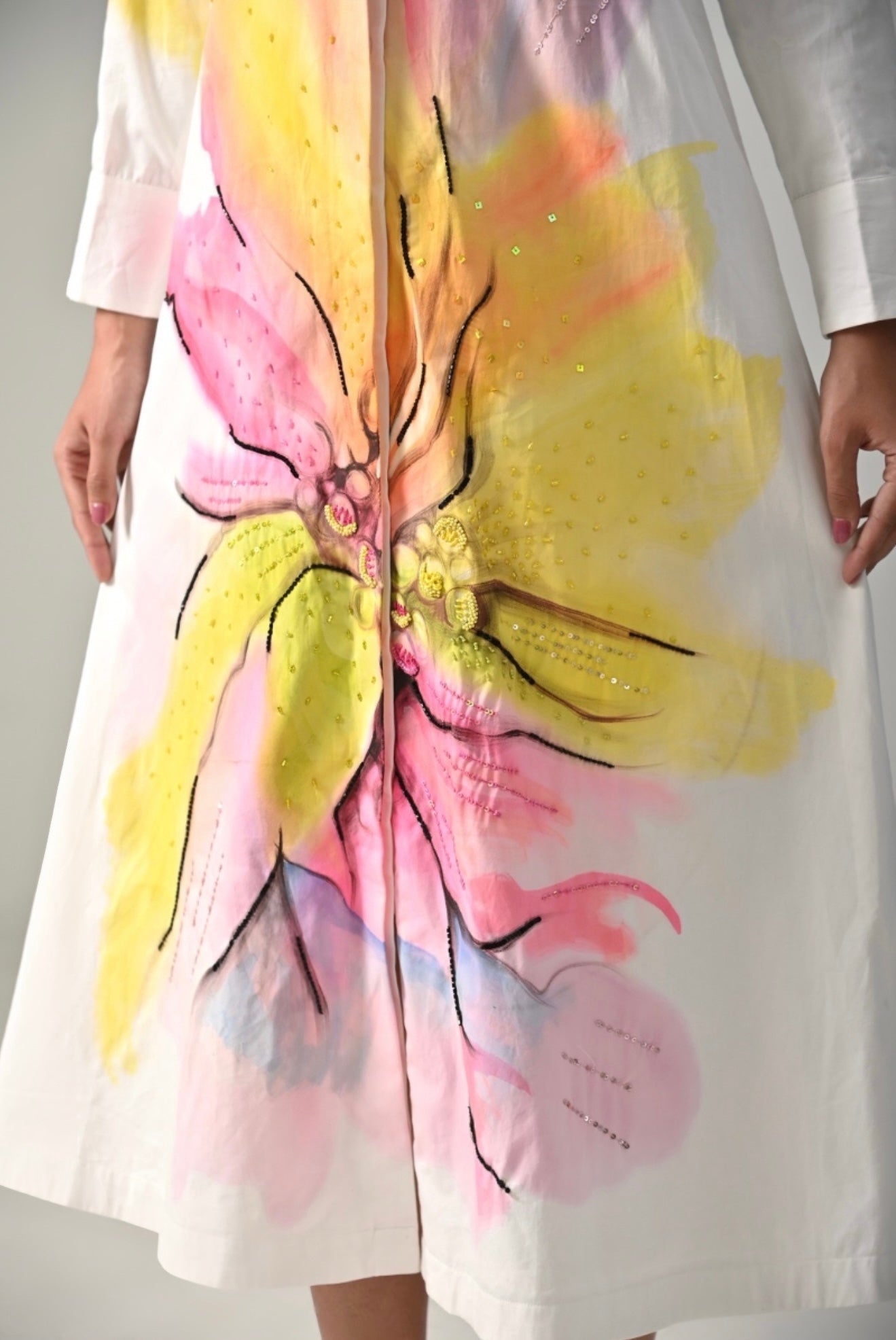 An eye for detail, literally. The embroidered peepers add edge to this icy blue co-ord, while the hand-painted floral skirt makes it sweet. High slits, structured shoulders, and charm that stares back.