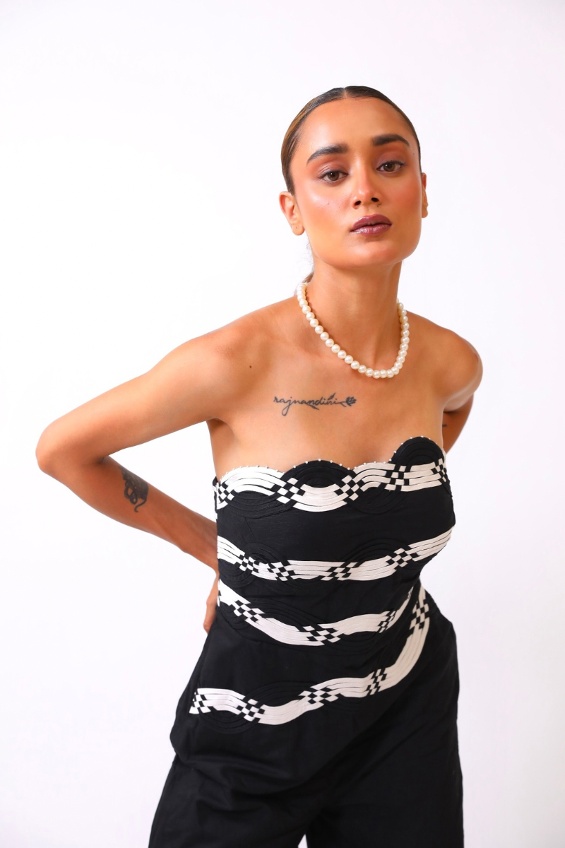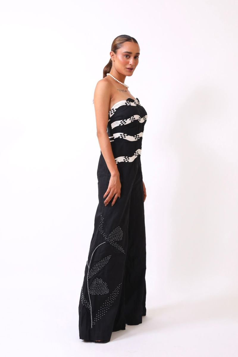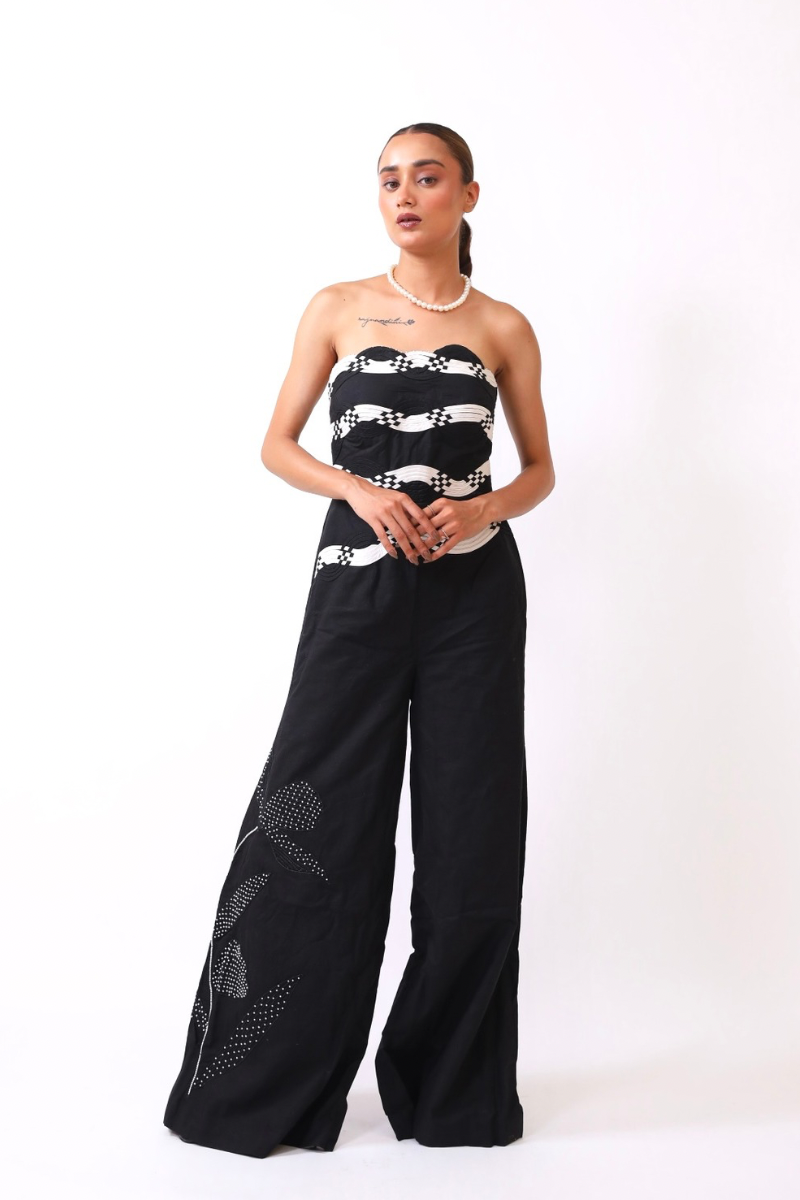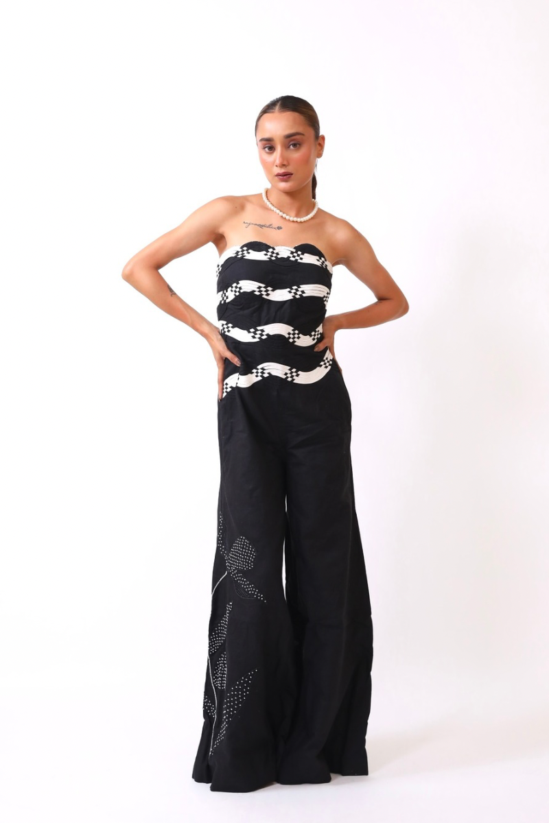 Geometric meets organic in this set, where contrast panels intersect bold stripes and floral illusions—a sketch come to life on fabric.