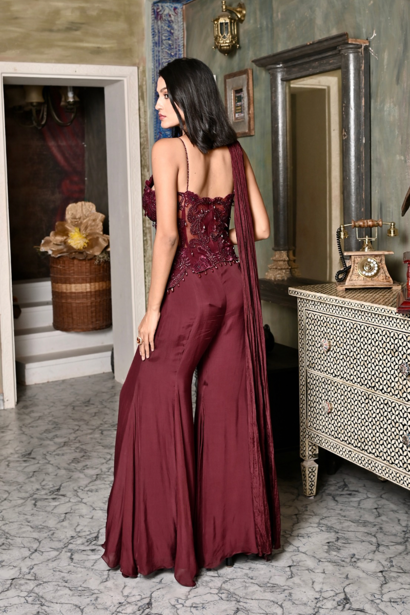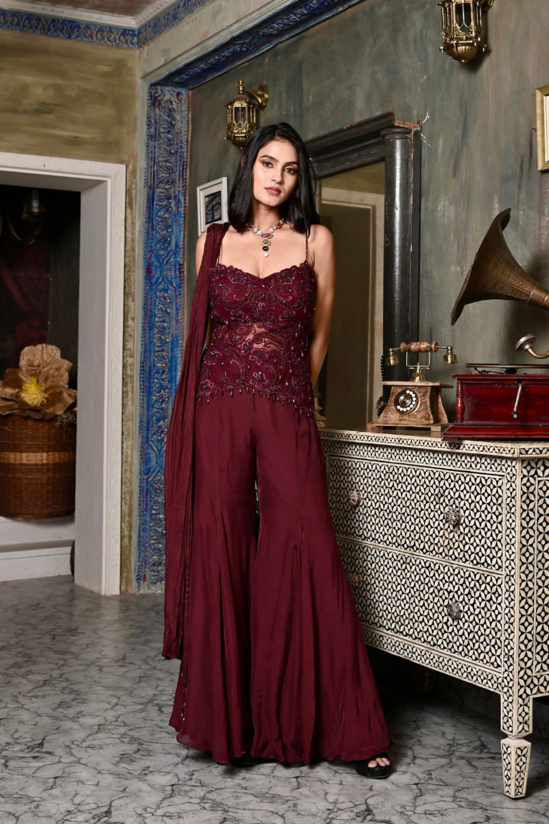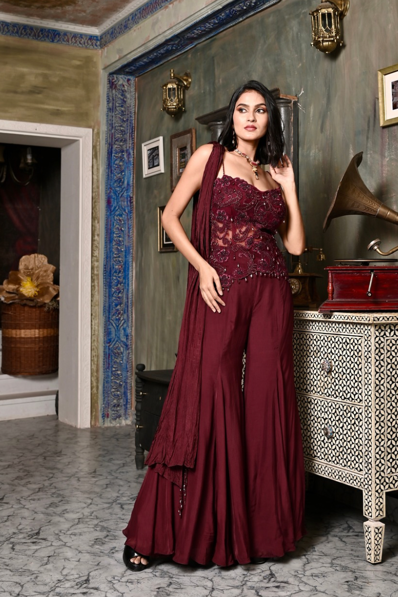 It's a glamorous fusion ensemble that combines intricate detailing with fluid, mmodern silhouettes-ideal for festive or evening occasions.
