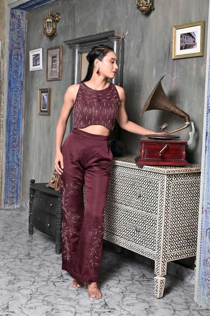 A sleeveless maroon crop top paired with matching high-waisted trousers, both adorned with intricate tonal embroidery.