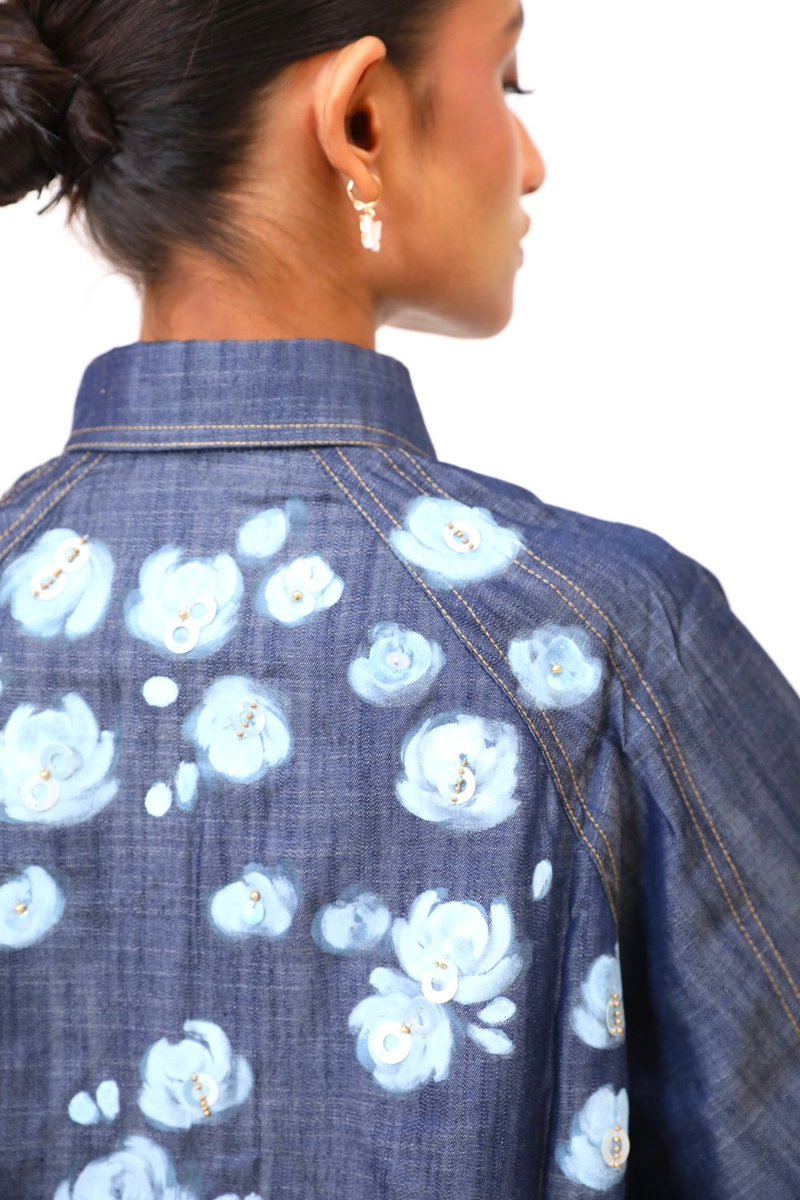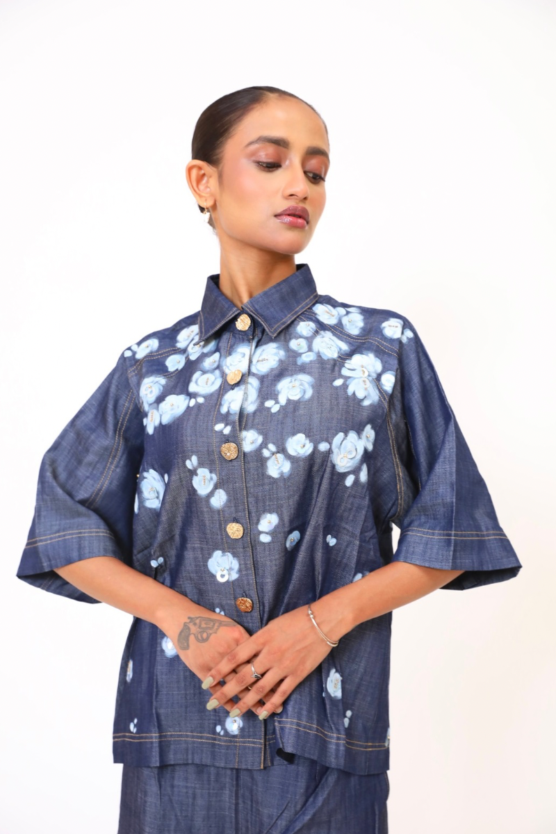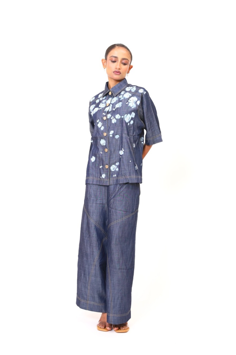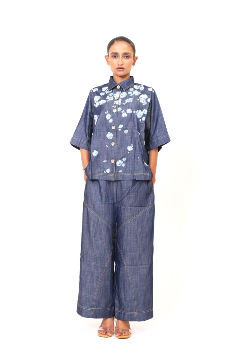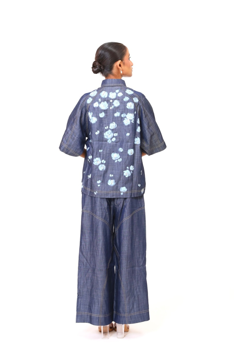 A relaxed coord set in lightweight denim, embroidered with a cascade of blooming white roses. The free-flowing silhouette is perfect for slow mornings and artistic escapes - comfort and craft in perfect rhythm.
