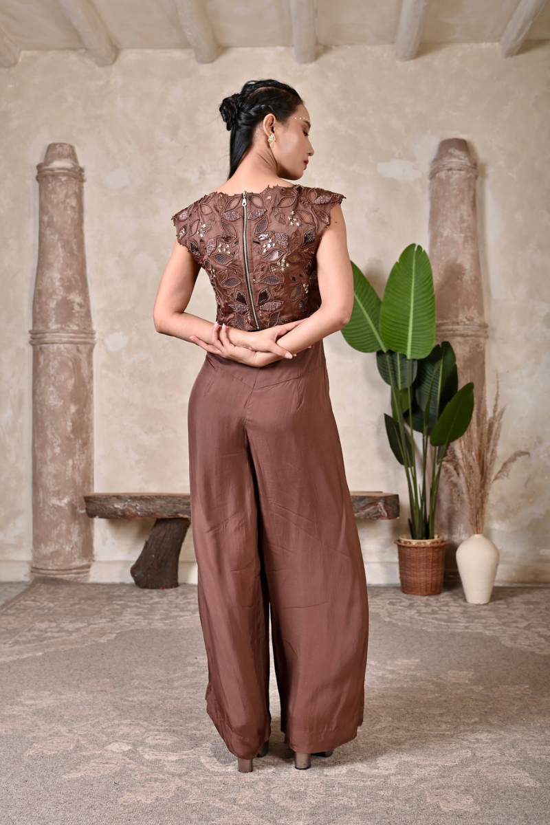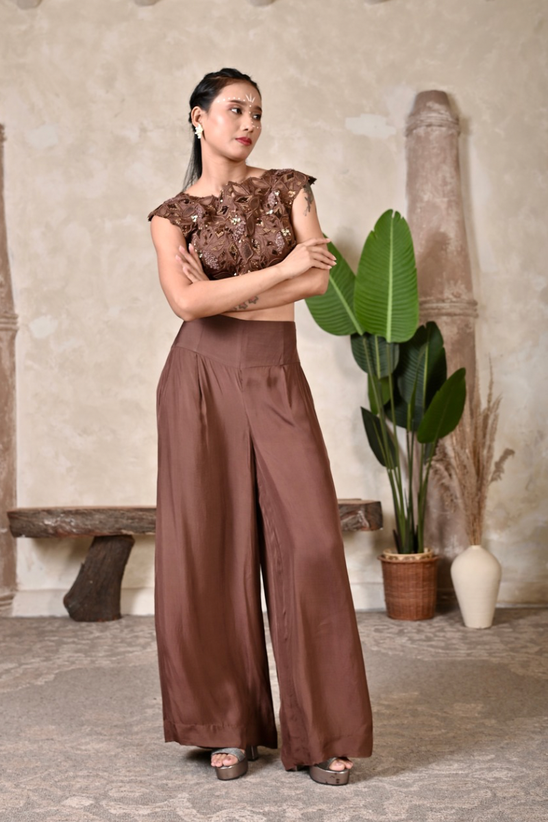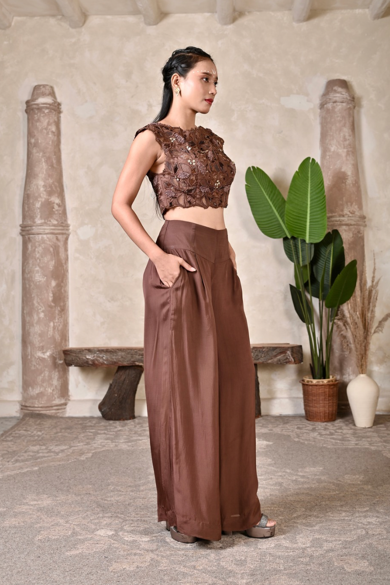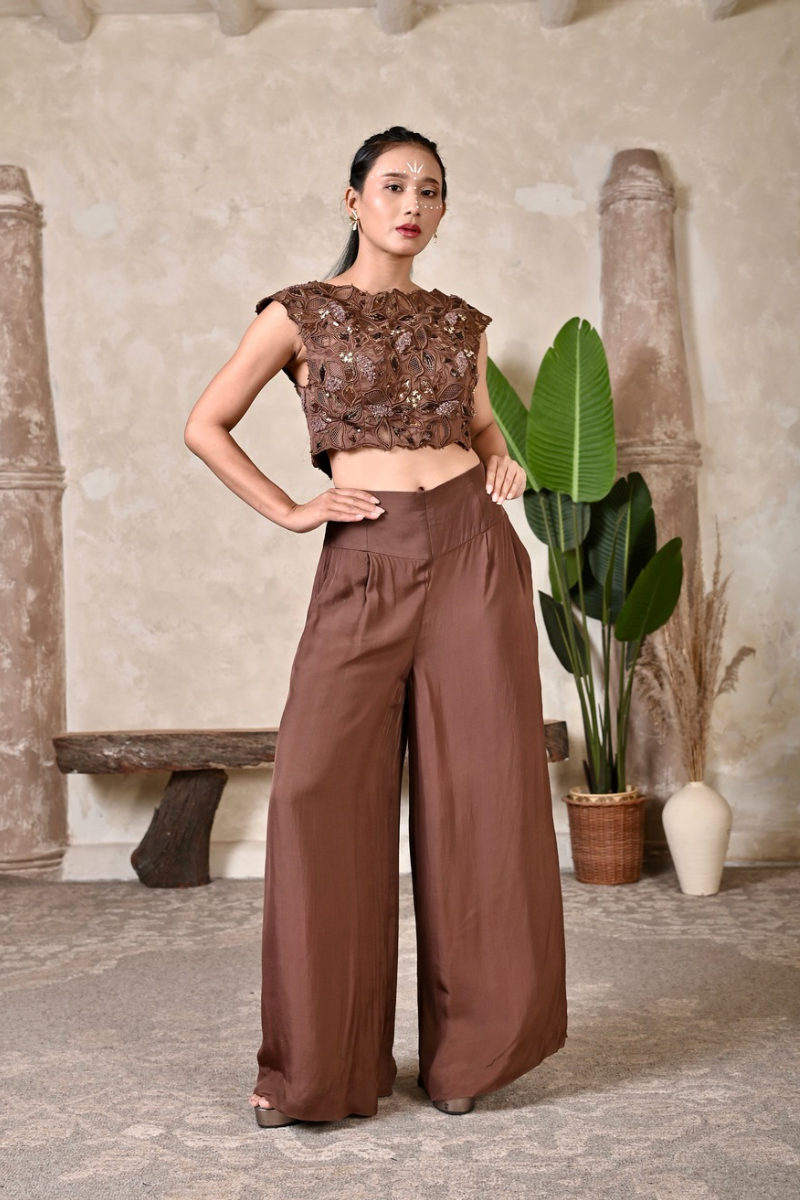 A stylish two-piece ensemble featuring a textured, floral embroidered crop top paired with high-waisted, wide-leg brown trousers.