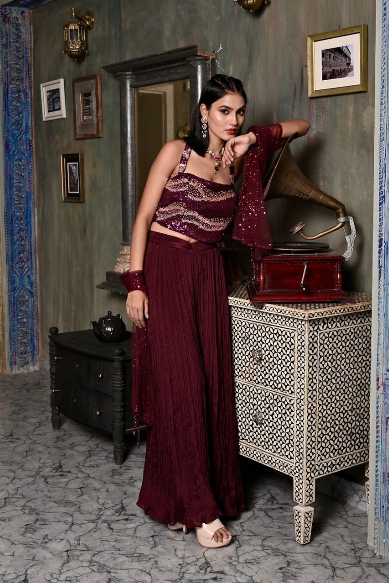 It blends modern glamour with traditional charm, making it perfect for festive or evening occasions.